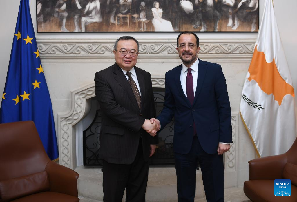 Liu Jianchao, head of the International Department of the Communist Party of China (CPC) Central Committee, meets with Cypriot President Nikos Christodoulides in Nicosia, Cyprus, June 6, 2025. A delegation of the CPC led by Liu Jianchao concluded a three-day visit to Cyprus Saturday. During the visit, Liu met and held discussions with Cypriot President Nikos Christodoulides; Annita Demetriou, president of the House of Representatives and president of the Democratic Rally Party, Democratic Party leader Nikolas Papadopoulos, General Secretary of the Progressive Party of Working People (AKEL)Stefanos Stefanou, and Acting Permanent Secretary of the Ministry of Foreign Affairs Theodora Constantinidou. The CPC delegation also visited a grassroots organization of AKEL in the Paphos District and Liu delivered a keynote speech to representatives from various sectors of Cypriot society, in which he expounded on China's policy toward Europe. [Photo by He Canling/Xinhua]