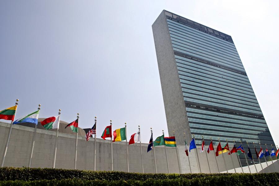 File photo shows the flags of member nations fly outside the General Assembly building at the United Nations headquarters in New York.