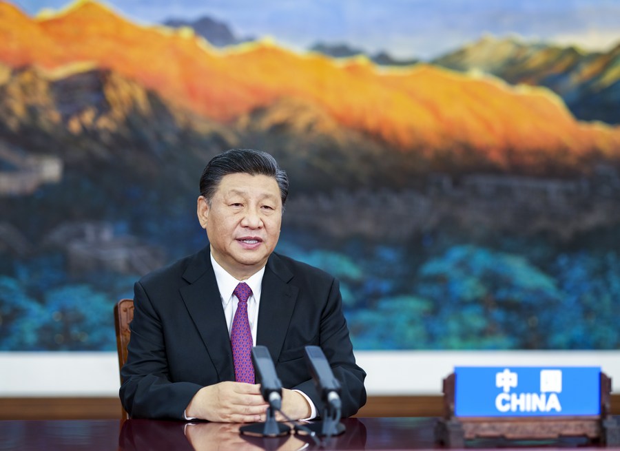 Chinese President Xi Jinping addresses the Informal Economic Leaders' Retreat of the Asia-Pacific Economic Cooperation (APEC) via video link in Beijing, capital of China, July 16, 2021. [Photo by Li Xueren/Xinhua]