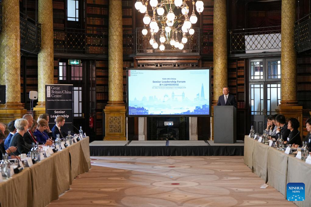 Liu Jianchao (at the podium), head of the International Department of the Communist Party of China Central Committee, speaks at the 13th UK-China Leadership Forum in London, Britain, on June 9, 2025. A delegation led by Liu Jianchao, head of the International Department of the Communist Party of China Central Committee, concluded a three-day visit to the United Kingdom (UK) on Tuesday after attending the 13th UK-China Leadership Forum in London. [Photo by Wu Lu/Xinhua]