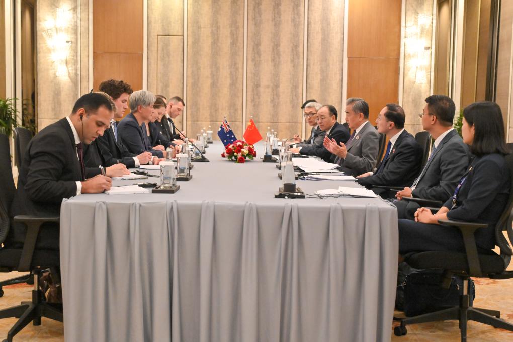 Chinese Foreign Minister Wang Yi, also a member of the Political Bureau of the Communist Party of China Central Committee, meets with Australian Foreign Minister Penny Wong in Kuala Lumpur, Malaysia, July 11, 2025. [Photo by Chong Voon Chung/Xinhua]