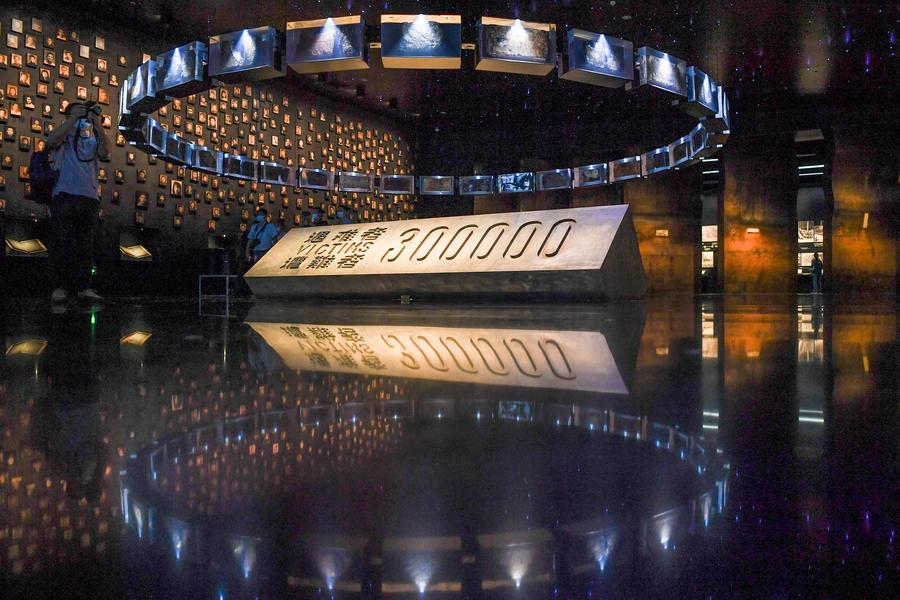 A reporter takes photos at the Memorial Hall of the Victims in Nanjing Massacre by Japanese Invaders in Nanjing, capital of east China's Jiangsu Province, September 18, 2021. [Photo/Xinhua]