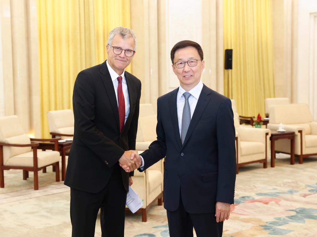 Chinese Vice President Han Zheng meets with Helge Lund, chair of the board of directors of Novo Nordisk, in Beijing, capital of China, Aug. 20, 2025. [Photo by Pang Xinglei/Xinhua]