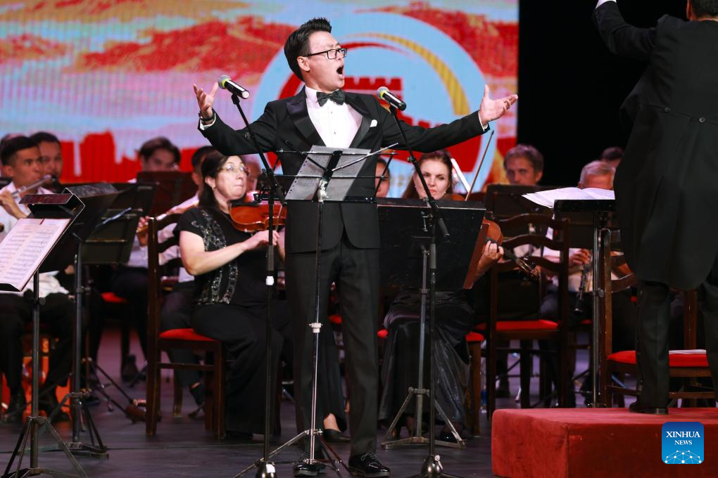 A singer performs during a concert commemorating the 80th anniversary of the victory in the Chinese People's War of Resistance Against Japanese Aggression and the World Anti-Fascist War in Bishkek, Kyrgyzstan, Aug. 21, 2025. [Photo by Roman/Xinhua]