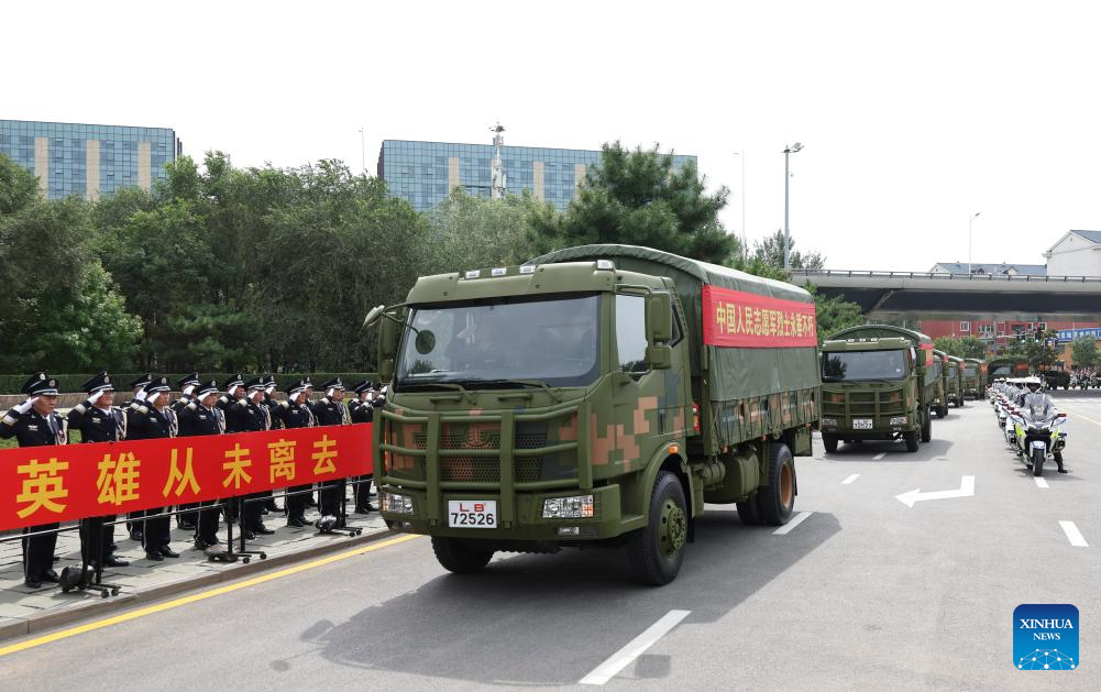 A motorcade delivering coffins containing the remains of the Chinese People's Volunteers (CPV) martyrs is seen in Shenyang, northeast China's Liaoning Province, Sept. 12, 2025. The remains of 30 Chinese People's Volunteers (CPV) soldiers who lost their lives during the War to Resist U.S. Aggression and Aid Korea (1950-1953) were returned to China on Friday from the Republic of Korea (ROK). [Photo by Yang Qing/Xinhua]