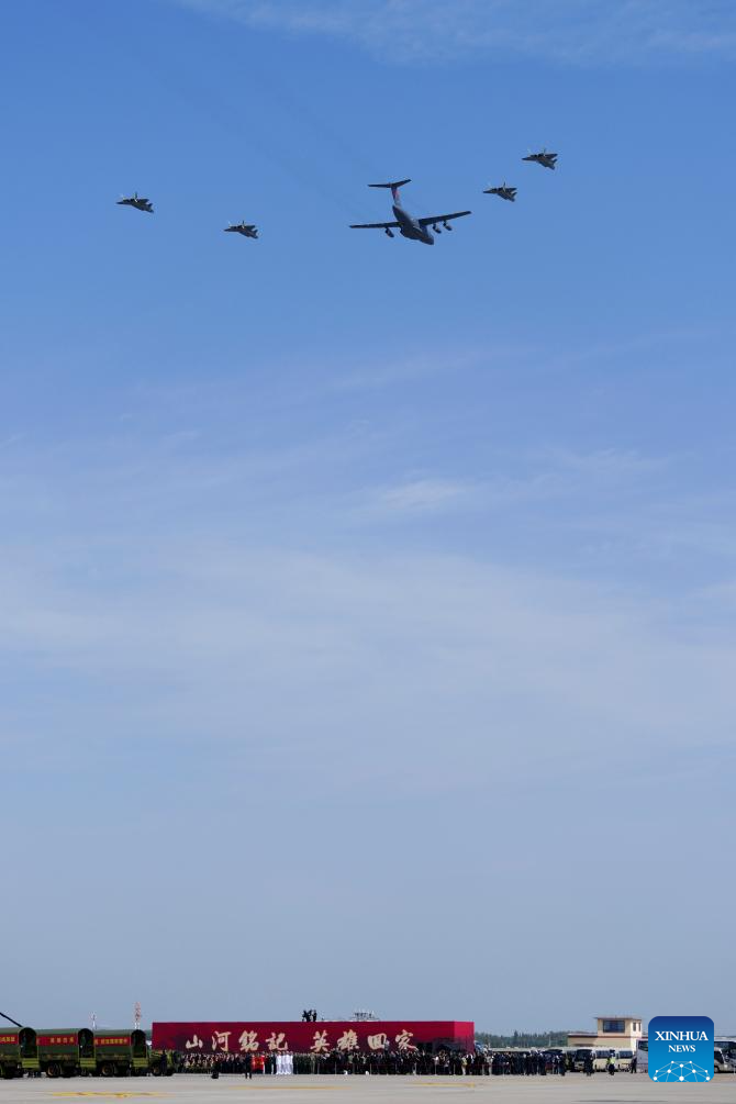 A Chinese People's Liberation Army (PLA) Air Force Y-20 transport aircraft carrying the remains of Chinese People's Volunteers (CPV) martyrs, escorted by four J-20 fighter jets, is pictured in Shenyang, capital of northeast China's Liaoning Province, on Sept. 12, 2025. The remains of 30 Chinese People's Volunteers (CPV) soldiers who lost their lives during the War to Resist U.S. Aggression and Aid Korea (1950-1953) were returned to China on Friday from the Republic of Korea (ROK). [Photo by Pan Yulong/Xinhua]