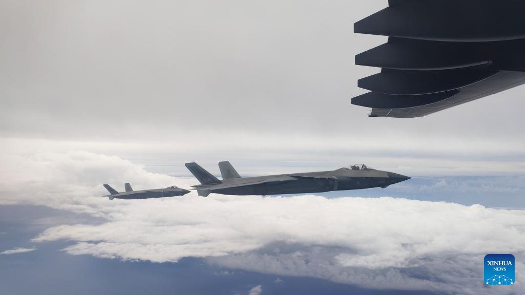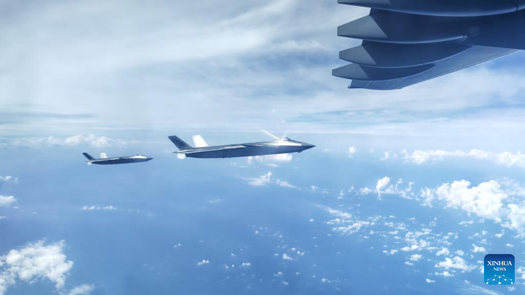 Two J-20 fighter jets of the Chinese People's Liberation Army (PLA) Air Force escort a Y-20 transport aircraft carrying the remains of Chinese People's Volunteers (CPV) martyrs on Sept. 12, 2025. The remains of 30 Chinese People's Volunteers (CPV) soldiers who lost their lives during the War to Resist U.S. Aggression and Aid Korea (1950-1953) were returned to China on Friday from the Republic of Korea (ROK). [Photo by Xiao Hang/Xinhua]