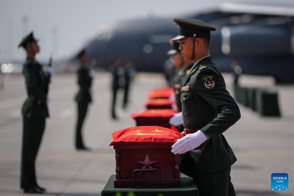 After the ROK handed over the martyrs' remains and belongings to the Chinese side in Incheon on Friday morning, China held a memorial ceremony at Incheon International Airport. During the ceremony, the Chinese national anthem was played, and each casket was draped with the national flag of China. Attendees bowed three times to the martyrs before their remains were placed onto the plane.