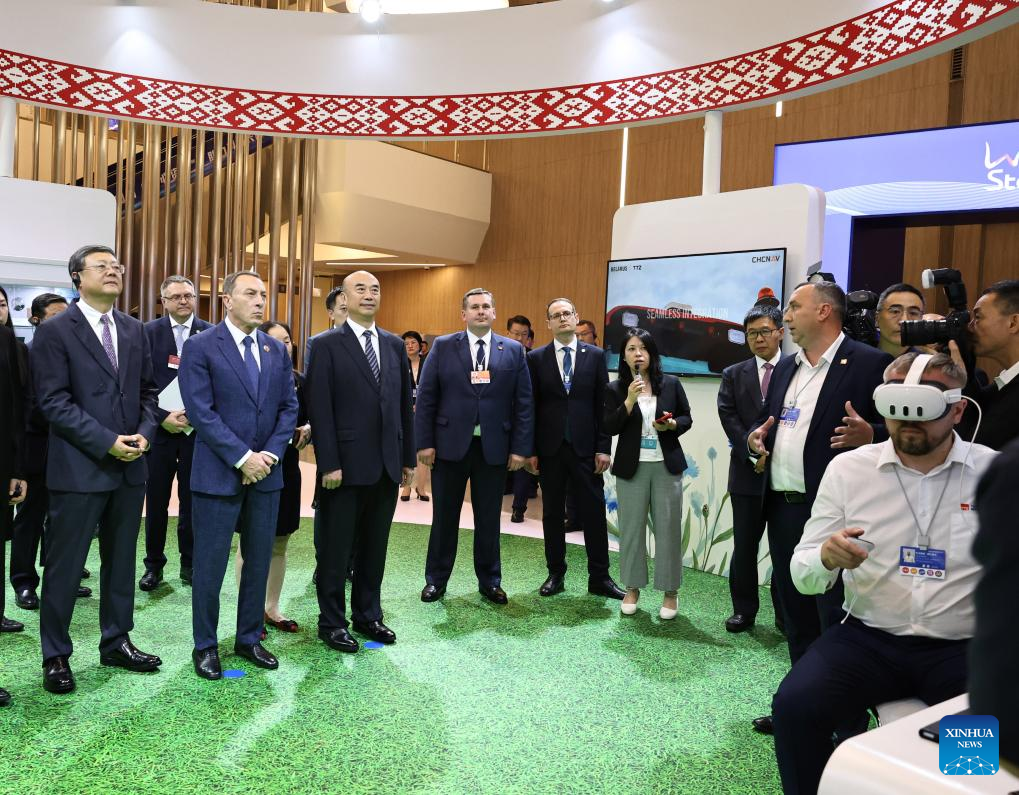 Chinese Vice Premier Liu Guozhong, also a member of the Political Bureau of the Communist Party of China Central Committee, visits an exhibition on achievements in China-Belarus scientific and technological innovation cooperation after the opening ceremony of the 2025 Pujiang Innovation Forum in Shanghai, east China, Sept. 20, 2025. Liu addressed the opening ceremony here on Saturday. [Photo by Fang Zhe/Xinhua]