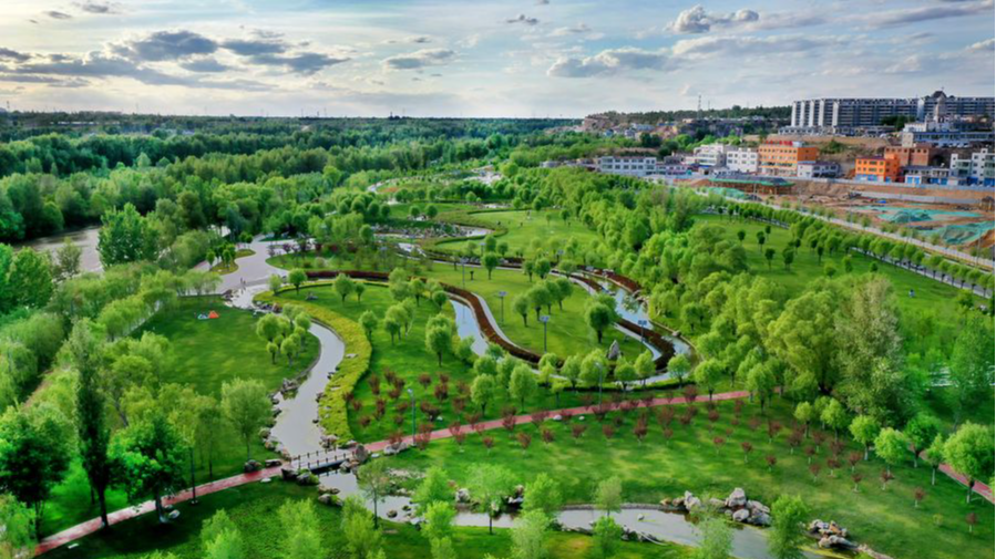 Aerial photo taken shows a green belt along Yuxi River in Yulin City, northwest China's Shaanxi Province, May 24, 2020. [Photo/Xinhua]