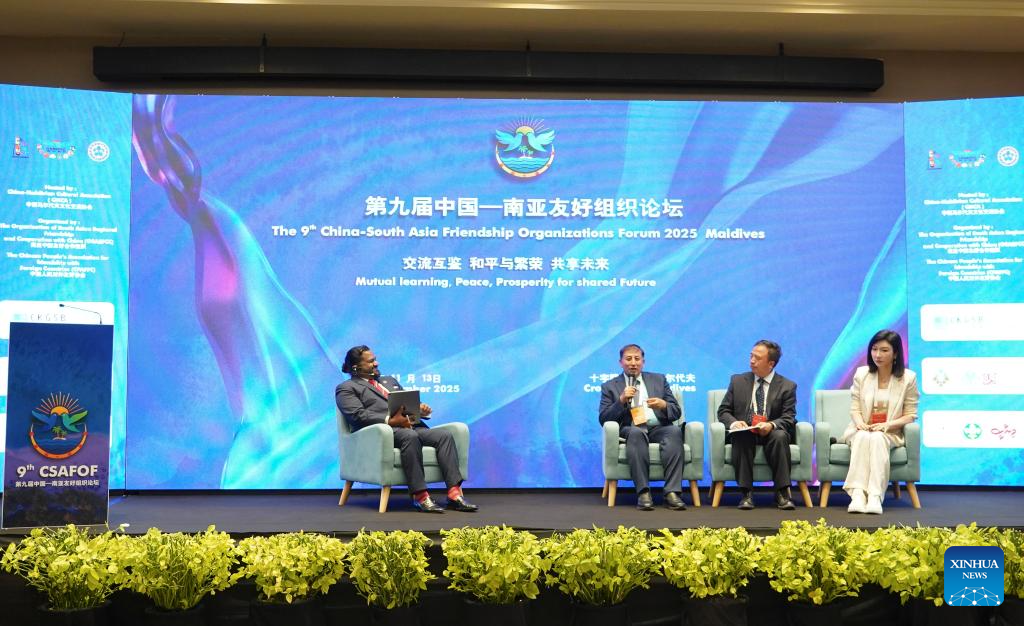 MALE, Nov. 14 (Xinhua) -- The 9th China-South Asia Friendship Organizations Forum was held in the Maldives from Thursday to Friday, which was jointly organized by the Chinese People's Association for Friendship with Foreign Countries (CPAFFC) and the Organization for South Asian Regional Friendship and Cooperation with China (OSARFCC).