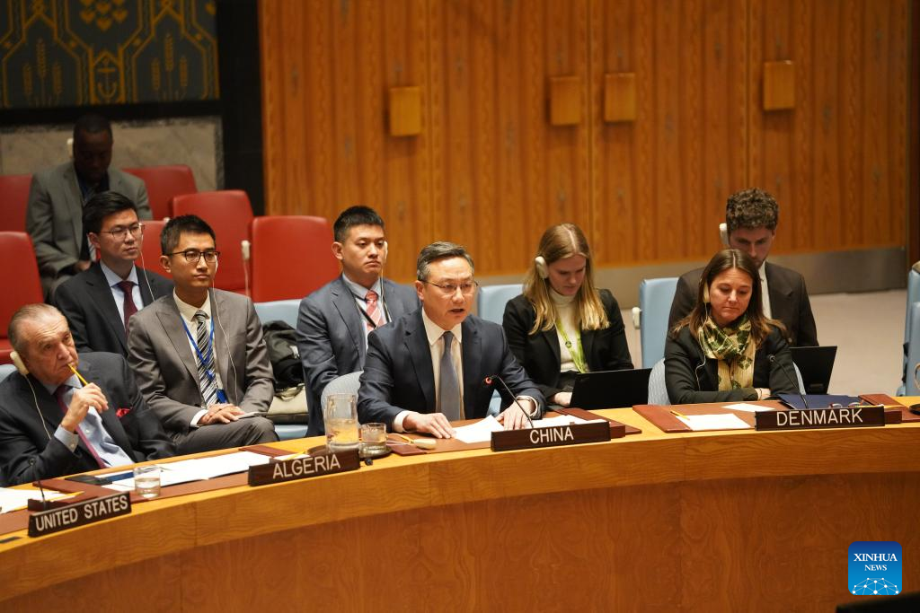 Sun Lei (C), China's deputy permanent representative to the United Nations, speaks at an emergency meeting of the Security Council at the UN headquarters in New York, on Dec. 29, 2025. [Photo by Zhang Fengguo/Xinhua]