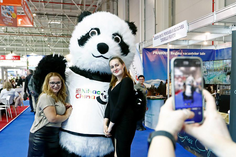 Visitors pose for photos with a giant panda mascot of China's stand at the autumn edition of Romania's Tourism Fair in Bucharest, Romania, Nov. 22, 2024. China's stand attracted visitors at Romania's Tourism Fair, which is held here from Nov. 21-24, as China has expanded its visa-free policy to nine additional countries including Romania, allowing their citizens to enter for up to 30 days without a visa for business, tourism, and other visits starting Nov. 30, 2024. [Photo/Xinhua]