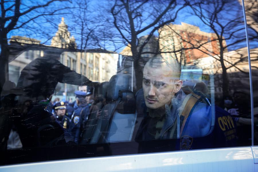 An arrested demonstrator sits in a New York Police Department (NYPD) van during a protest against the Donald Trump administration's policies on the Middle East, campus protests and immigration in New York City, the United States, March 11, 2025. [Photo by Michael Nagle/Xinhua]