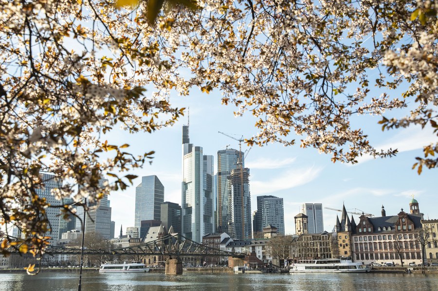 This photo taken on March 14, 2024 shows flowers at the bank of Main River in Frankfurt, Germany. [Photo by Zhang Fan/Xinhua]