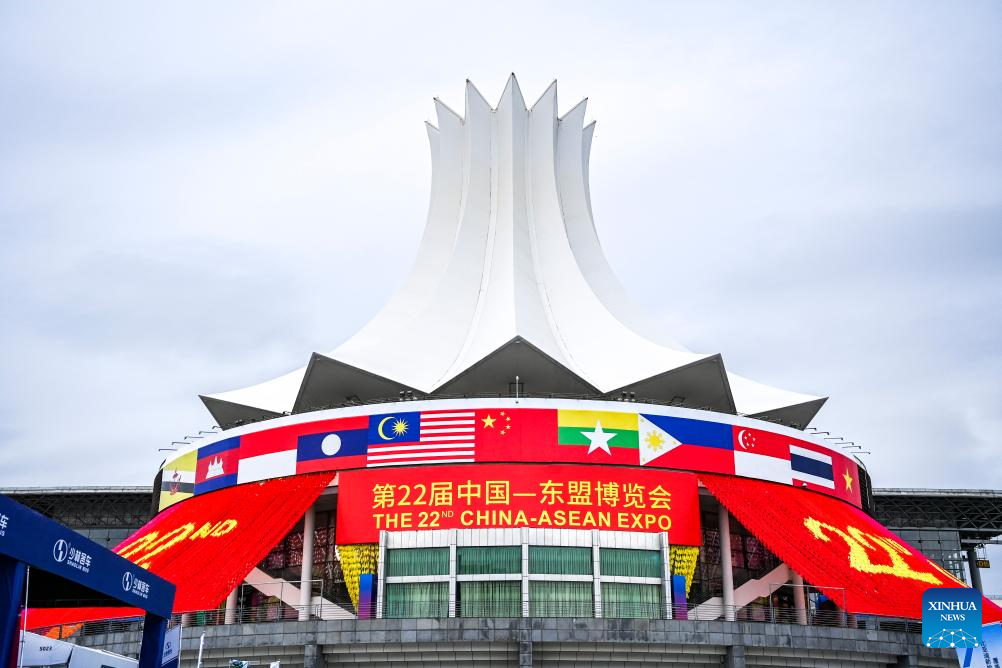 This photo taken on Sept. 17, 2025 shows a view of Nanning International Convention and Exhibition Center in Nanning, capital of south China's Guangxi Zhuang Autonomous Region. The 22nd China-ASEAN Expo and the China-ASEAN Business and Investment Summit kicked off here on Wednesday. [Photo by Cao Yiming/Xinhua]