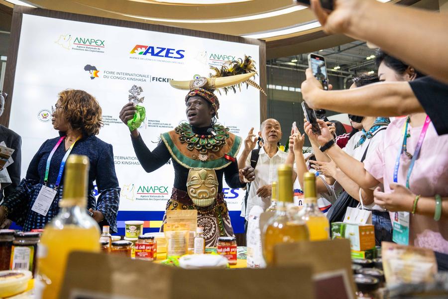 An exhibitor (2nd L) introduces African products to visitors during the fourth China-Africa Economic and Trade Expo at Changsha International Convention and Exhibition Center in Changsha, central China's Hunan Province, June 13, 2025. [Photo by Chen Sihan/Xinhua]