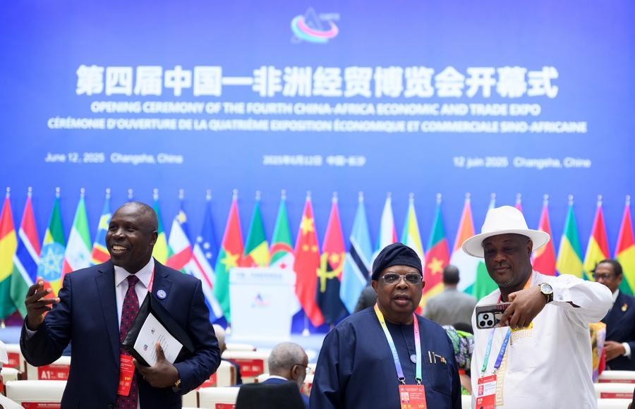 This photo taken on June 12, 2025 shows guests talking prior to the opening ceremony of the fourth China-Africa Economic an Trade Expo in Changsha, central China's Hunan Province. [Photo by Jin Liangkuai/Xinhua]
