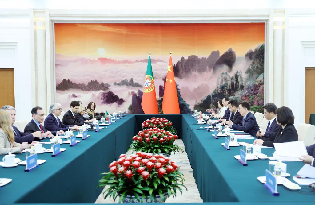 Chinese Vice President Han Zheng meets with Jose Pedro Aguiar-Branco, speaker of the Portuguese parliament, in Beijing, capital of China, April 8, 2026. [Photo by Yao Dawei/Xinhua]