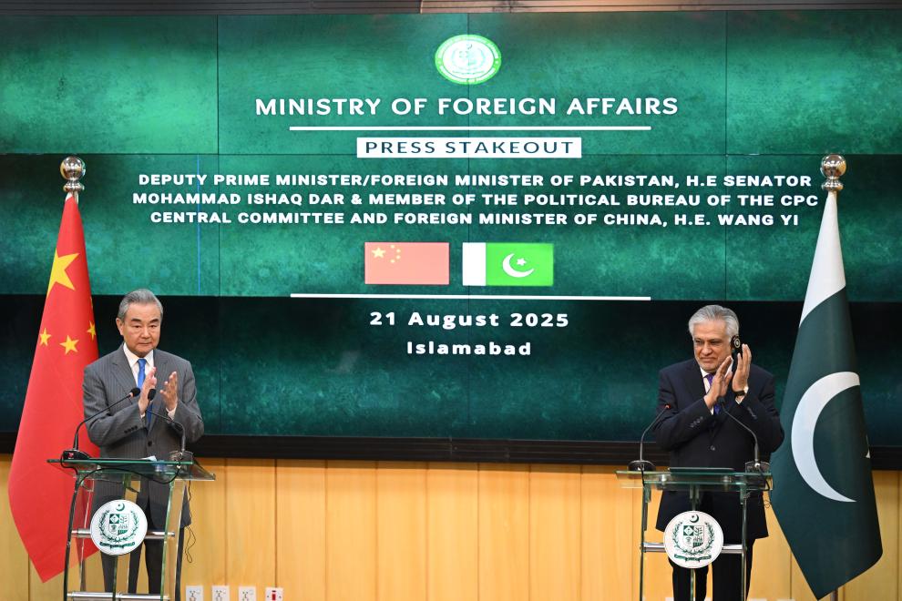 Chinese Foreign Minister Wang Yi, also a member of the Political Bureau of the Communist Party of China Central Committee, holds a joint press conference with Pakistani Deputy Prime Minister and Foreign Minister Mohammad Ishaq Dar after the Sixth Round of China-Pakistan Foreign Ministers' Strategic Dialogue in Islamabad, Pakistan, Aug. 21, 2025. [Photo by Ahmad Kamal/Xinhua]