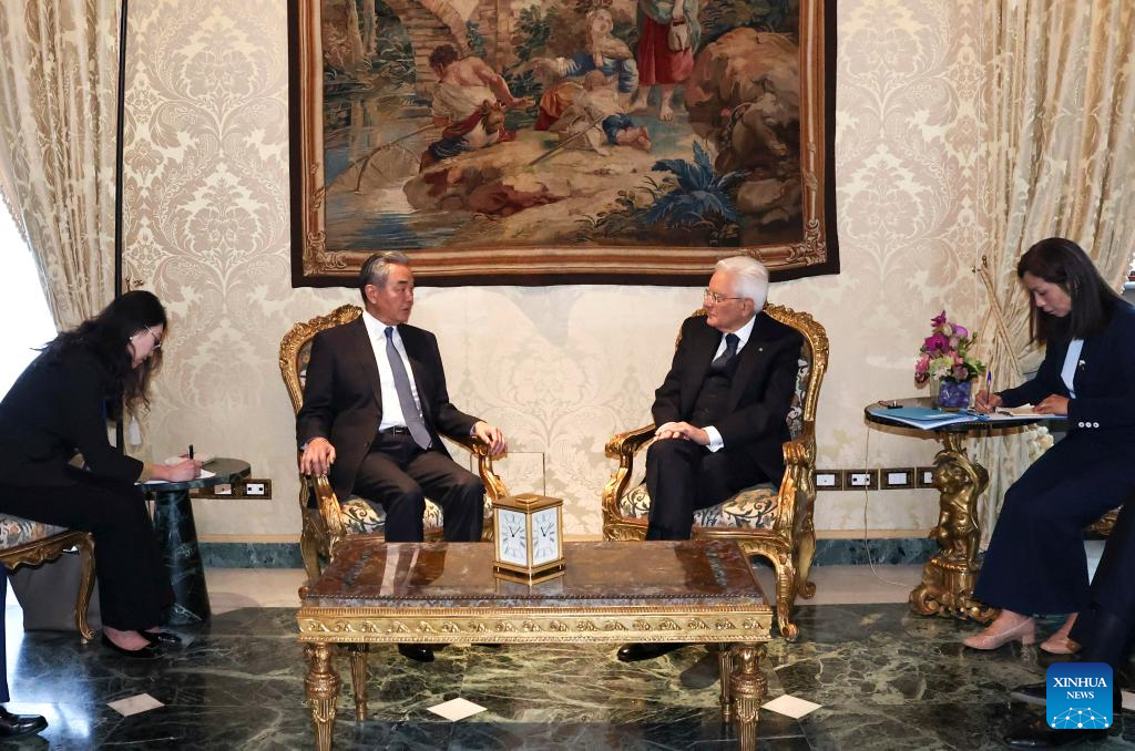 Italian President Sergio Mattarella meets with Chinese Foreign Minister Wang Yi, also a member of the Political Bureau of the Communist Party of China Central Committee, in Rome, Italy, Oct. 9, 2025. [Photo by Li Jing/Xinhua]