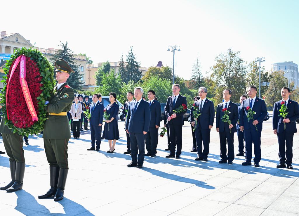 Li Xi, a member of the Standing Committee of the Political Bureau of the Communist Party of China (CPC) Central Committee and Secretary of the CPC Central Commission for Discipline Inspection, lays a wreath at the Victory Monument in Belarus, Sept. 22, 2025. Li on Tuesday concluded an official goodwill visit to Belarus. [Photo by Yue Yuewei/Xinhua]